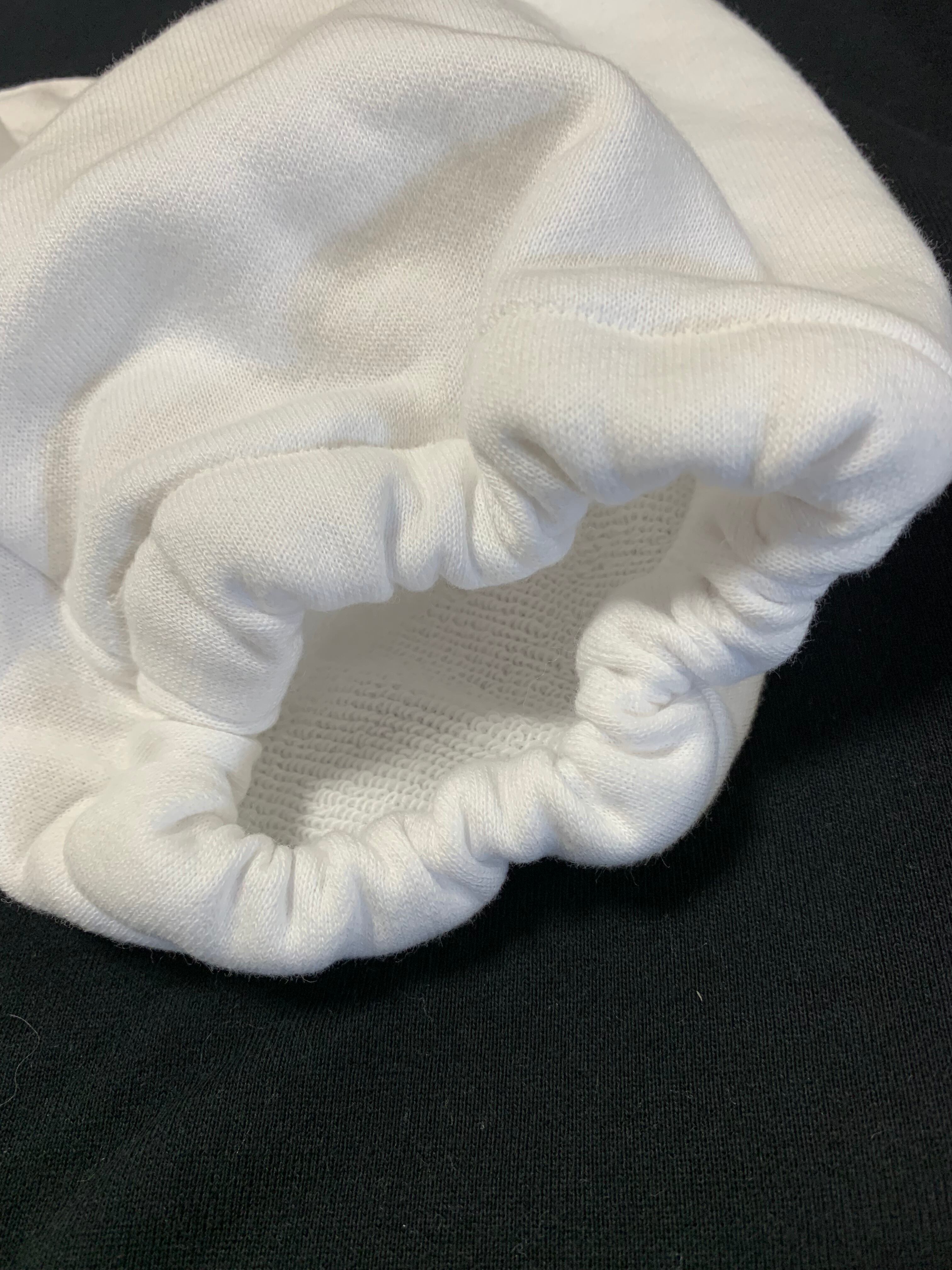 ウエストのゴムは調整できるように出してあります。ゴムの出し入れできるところにタグを付けています。(タグが付いている方が前です)